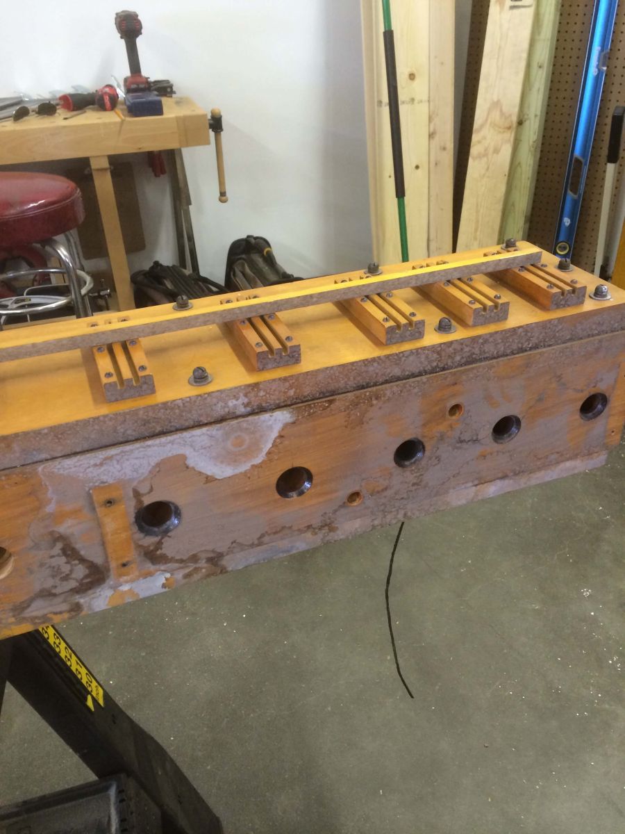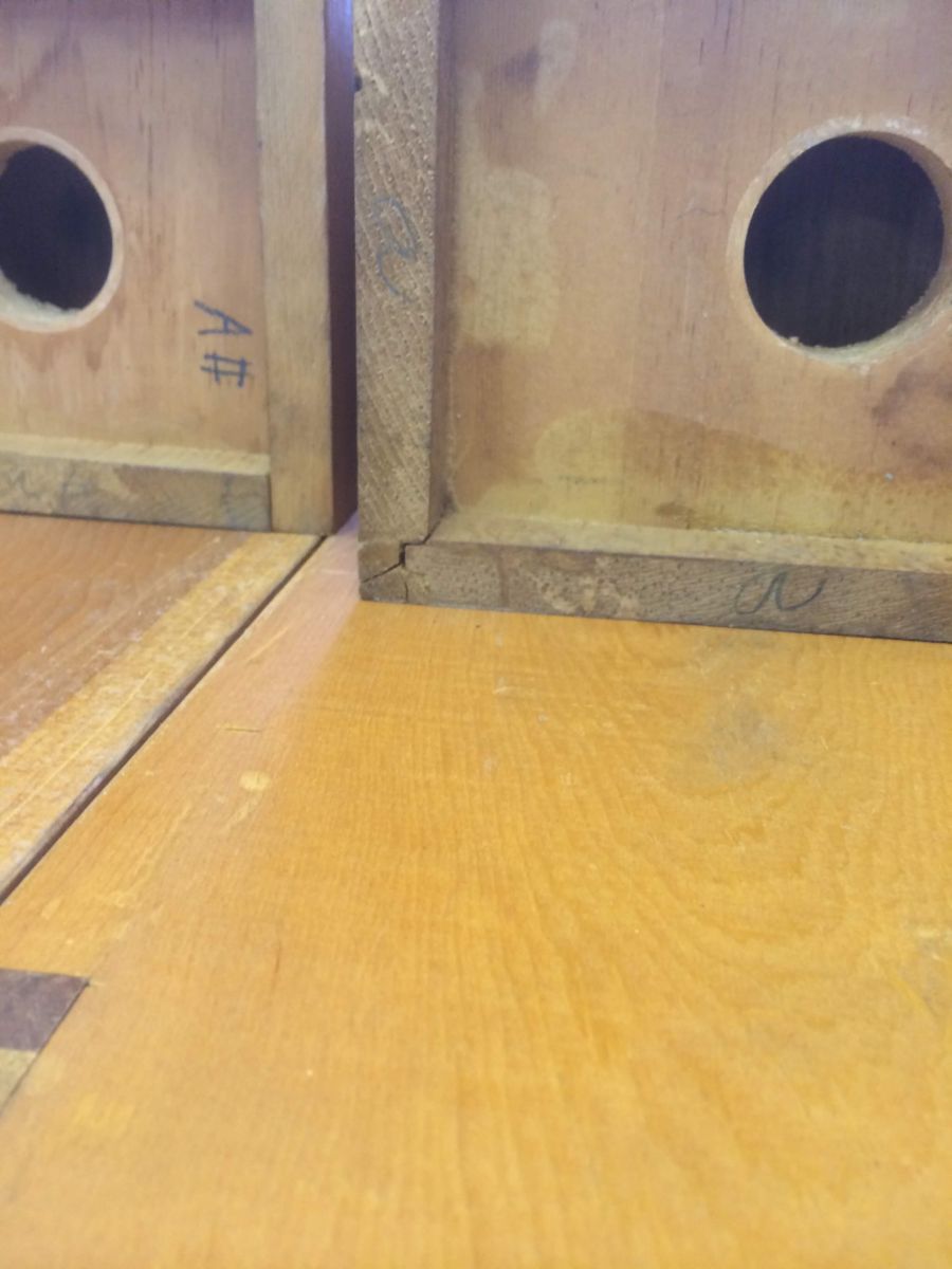 More of the wind chest mold. Water got to the inside as well, so we basically had to "start over" and go down to the wood and replace all damaged components, including valves and the leather that carries the valves inside.