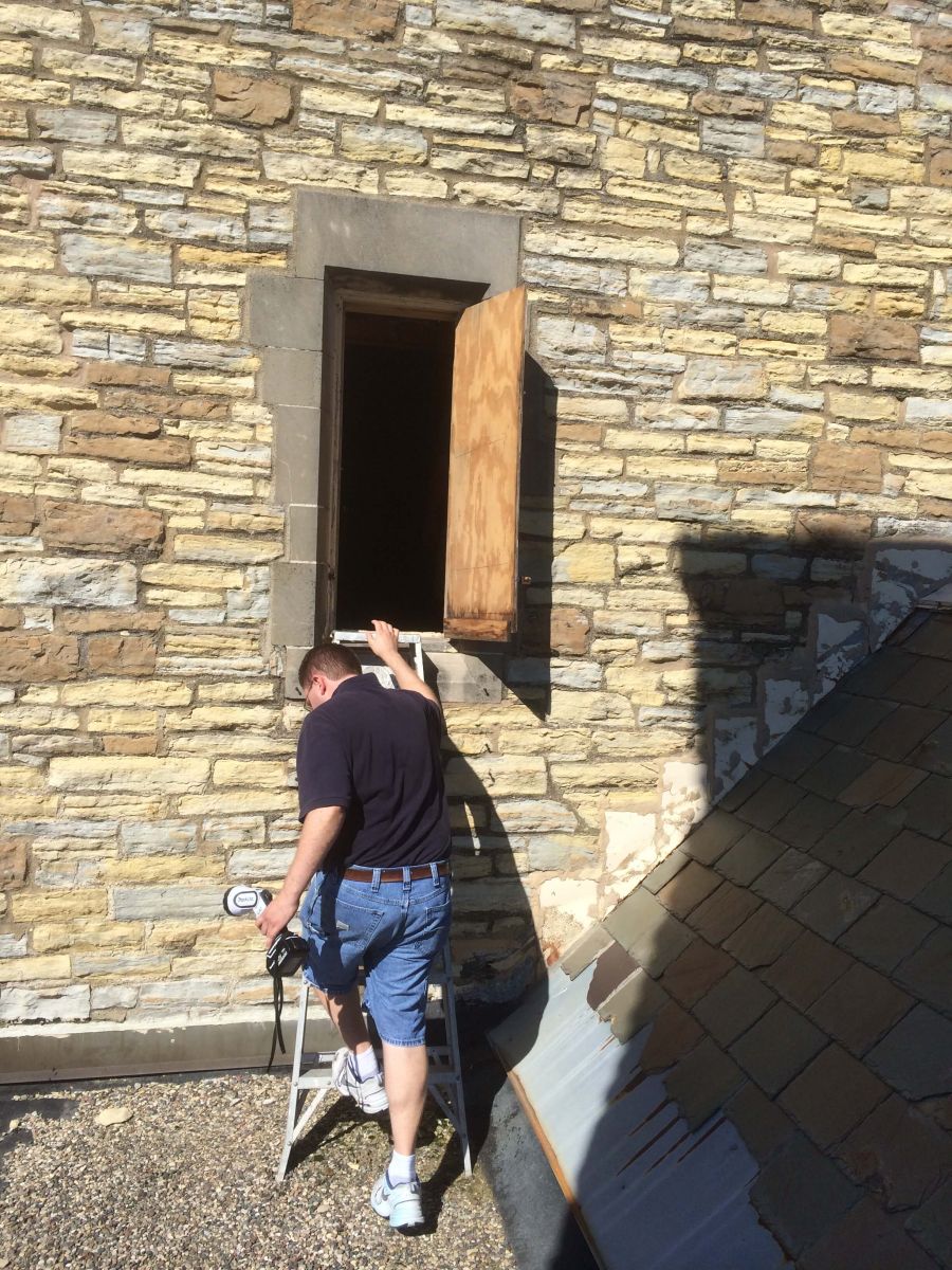Most of the St. Luke's organ is above the ceiling, in the church tower. To get to it for tuning or servicing one must go out onto the church roof and then climb a ladder to reach this door on the tower. Then follows a walk on a narrow plank over the tone opening to the church below before reaching the relative safety of the organ chamber! Here, David Grandall is about to climb through the door.