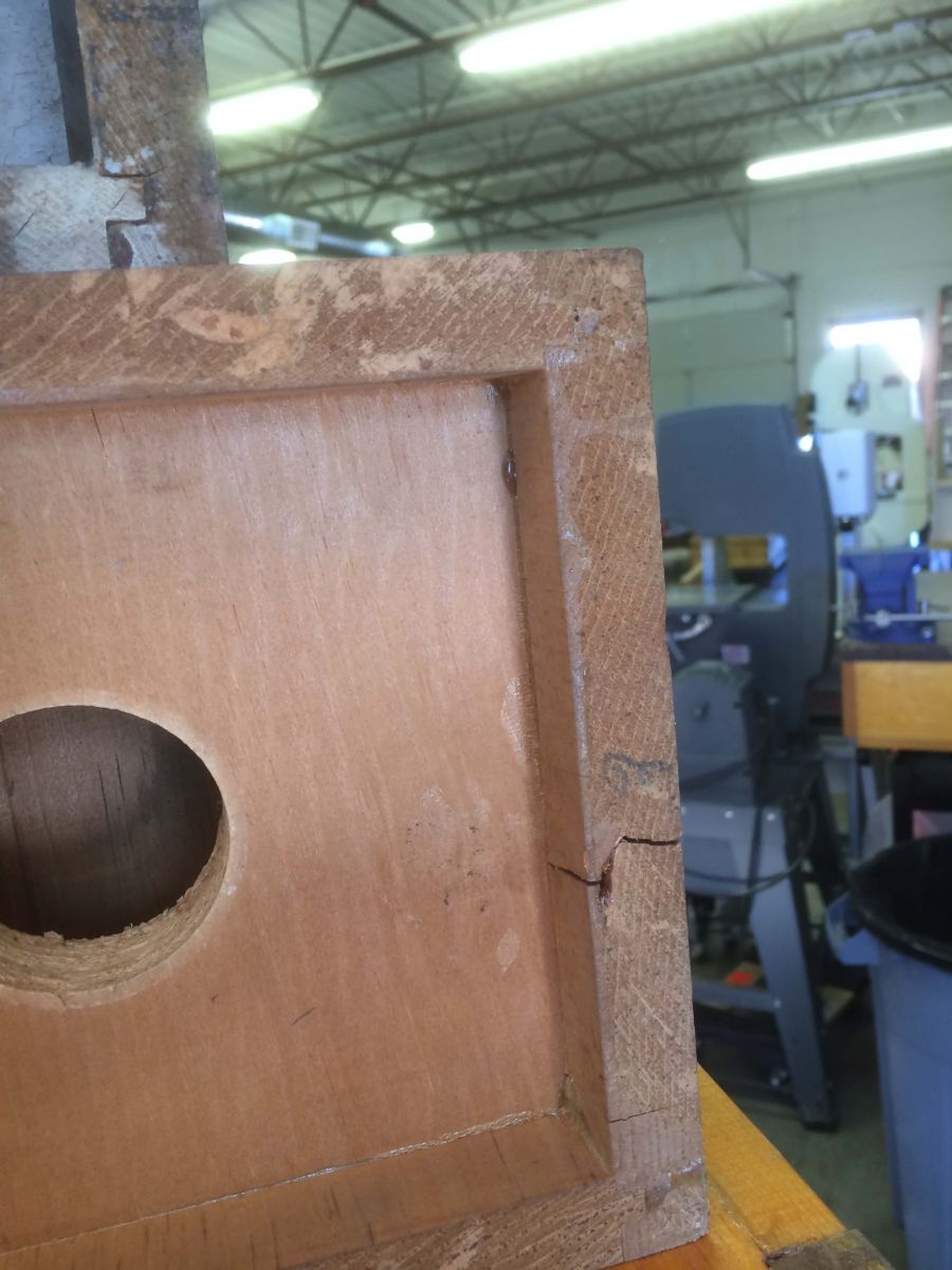 Here is a very bad, compound crack that extends into the speaking area of the pipe. This pipe would not speak properly.